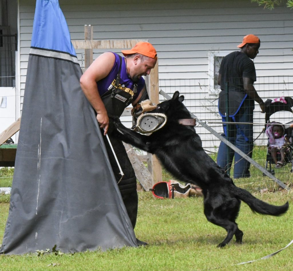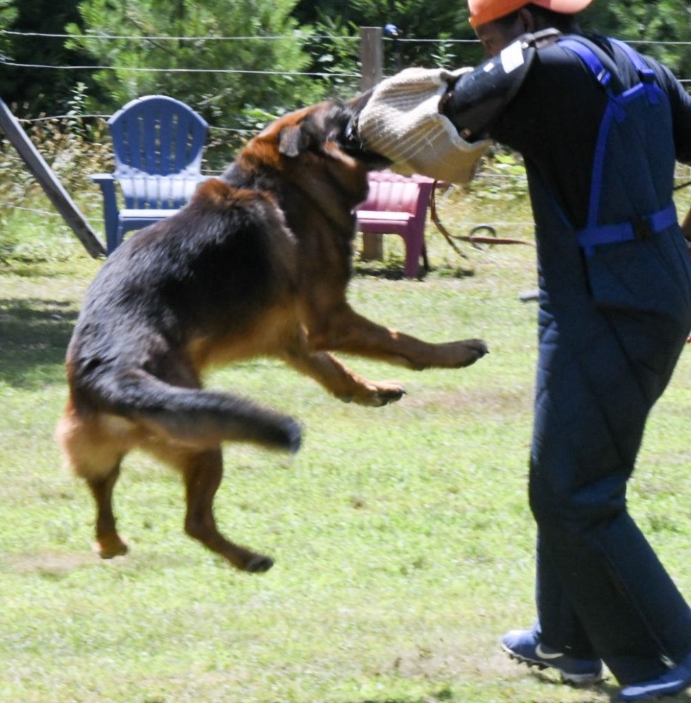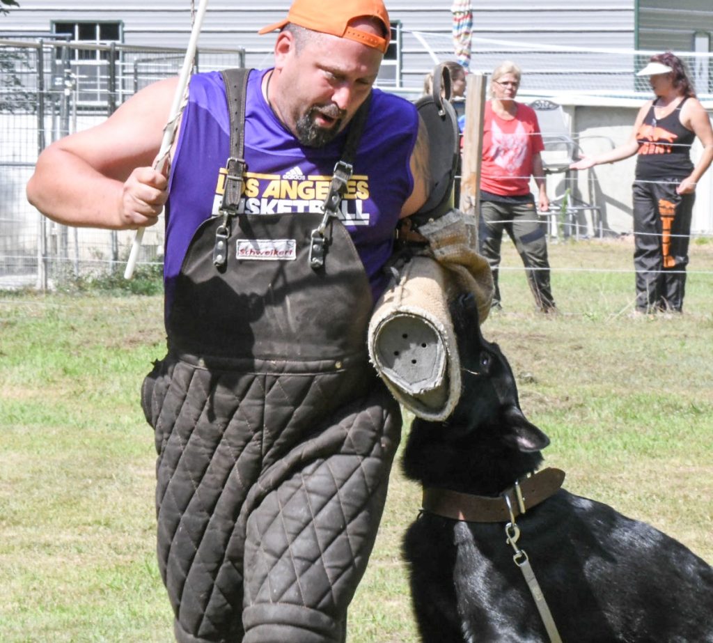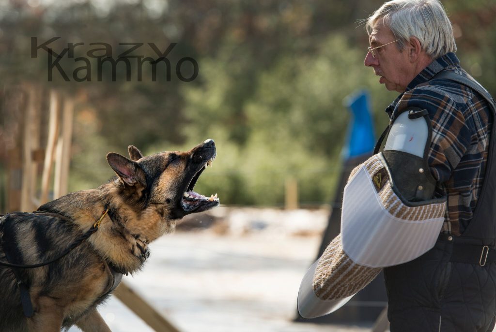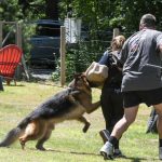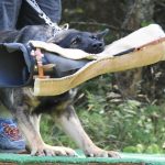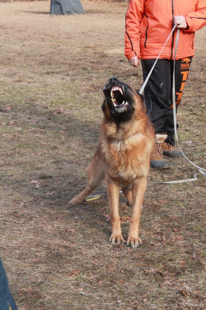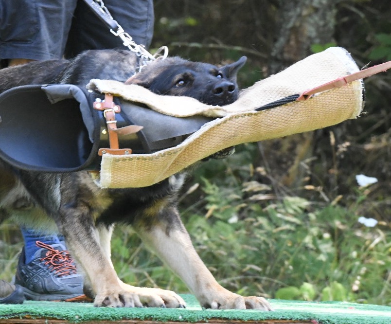 The protection phase tests a dog ability to react appropriately and be under control at all times. The dog must find a hidden decoy and hold him in place with strong barking without a bite. The dog must return to the handler when called, prevent escapes and attacks by biting, yet be able to immediately release the bite and bark or sit quietly at the handler’s side. The dog and handler are required to heel next to the decoy, and transport him to the judge, yet remain ready for defense against an attack. Dogs that are out of control are dismissed, as well as dogs that do not release the bite.