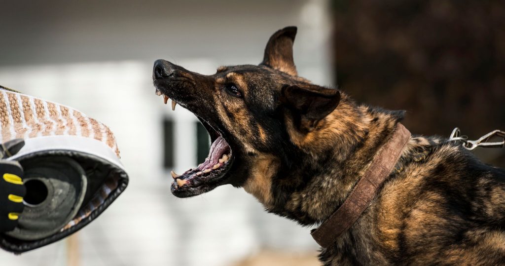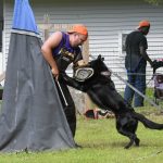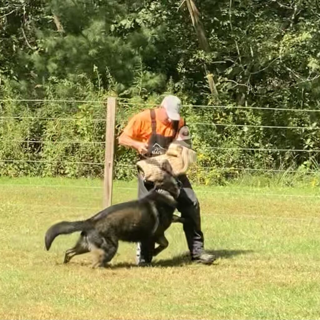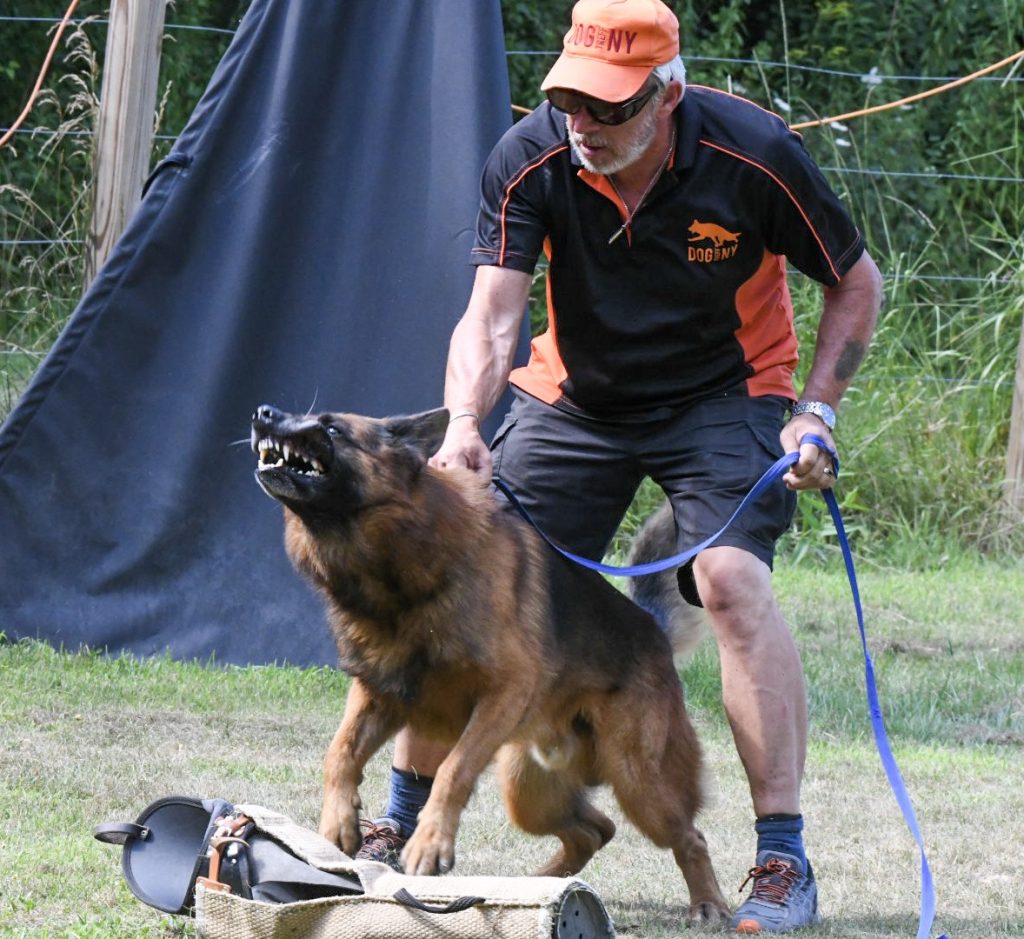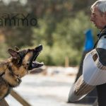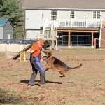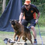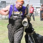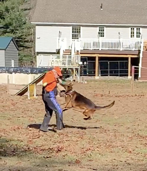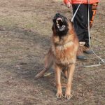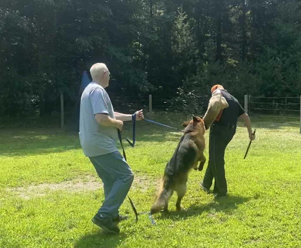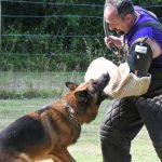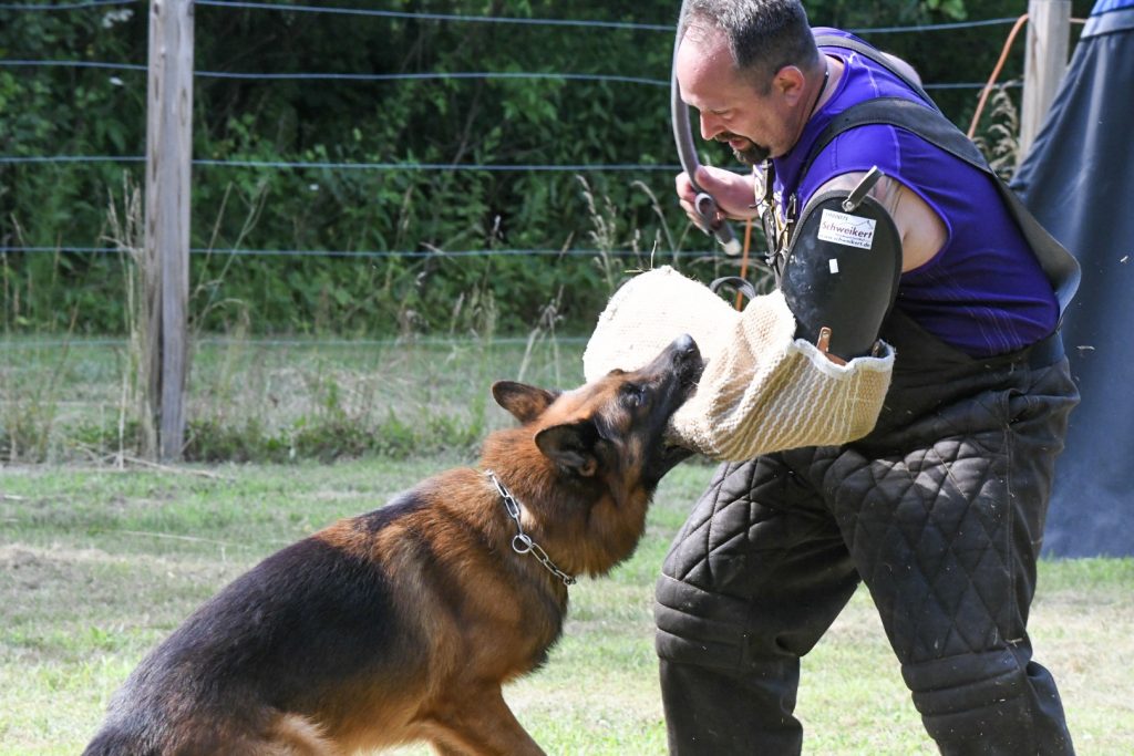 The protection phase tests a dog ability to react appropriately and be under control at all times. The dog must find a hidden decoy and hold him in place with strong barking without a bite. The dog must return to the handler when called, prevent escapes and attacks by biting, yet be able to immediately release the bite and bark or sit quietly at the handler’s side. The dog and handler are required to heel next to the decoy, and transport him to the judge, yet remain ready for defense against an attack. Dogs that are out of control are dismissed, as well as dogs that do not release the bite.