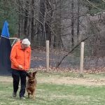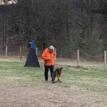 Tracking in Schutzhund is sometimes referred to as “footstep tracking.” The dog is required to keep his nose on the ground the entire track and locate certain articles strategically placed on the track. A Schutzhund 1 track is laid by the handler, approximately 300 paces long, and aged approximately 20 minutes. The most advanced tracking titles are over 1800 paces, aged for 3 hours, and involve complex angles, varying surfaces, and are laid by a stranger. Tracking is a test of the dog’s ability to concentrate on a single task for extended periods of time, and independence in solving problems, as the handler must be 33 feet behind the dog. The working out of the track must be methodical and precise.