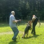 The obedience phase requires many of the same exercises that are seen in other venues, such as heeling, sits, downs, and retrieves. In a Schutzhund routine, the paired handlers must report with their dogs off leash. One dog performs a long down while the other does the routine. During the heeling pattern two shots are fired from a starter pistol to test the dog’s sound sensitivity. Later the dog must be heeled through a moving group of people. Dogs must retrieve large dumbbells on flat, over a 1 meter jump and an A Frame, and must be under voice control with no hand signals. Handler help is penalized, and may result in dismissal from the trial.